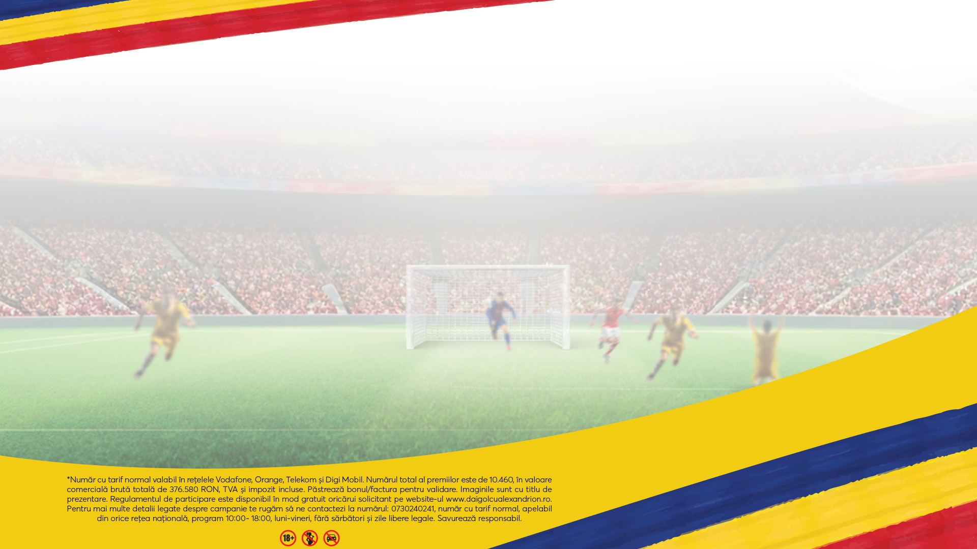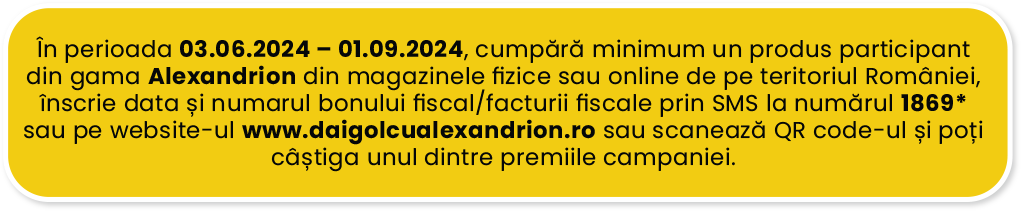 *Număr cu tarif normal valabil în rețelele Vodafone, Orange, Telekom și Digi Mobil. Numărul total al premiilor este de 10.460, în valoare comercială brută totală de 376.580 RON, TVA și impozit incluse. Păstrează bonul/factura pentru validare. Imaginile sunt cu titlu de prezentare. Regulamentul de participare este disponibil în mod grauit oricărui solicitant pe website-ul www.daigolcualexandrion.ro. Pentru mai multe detalii legate despre campanie te rugăm să ne contactezi la numărul: 0730240241, număr cu tarif normal, apelabil din orice rețea națională, program 10:00 - 18:00, luni-vineri, fără sărbători și zile libere legale. Savurează responsabil.